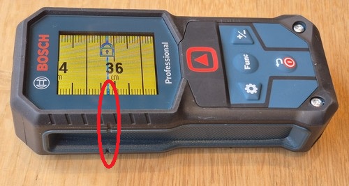 - Massbandfunktion, die digital ein Massband oder einen Doppelmeter abbildet. Hier hat Bosch am Gehäuse Kerben angebracht, die die digitale Messlinie vom Display auf das Gehäuse übertragen, so dass bei Nutzung der Funktion, Masse einfach per Bleistift auf den Untergrund übertragen werden können.